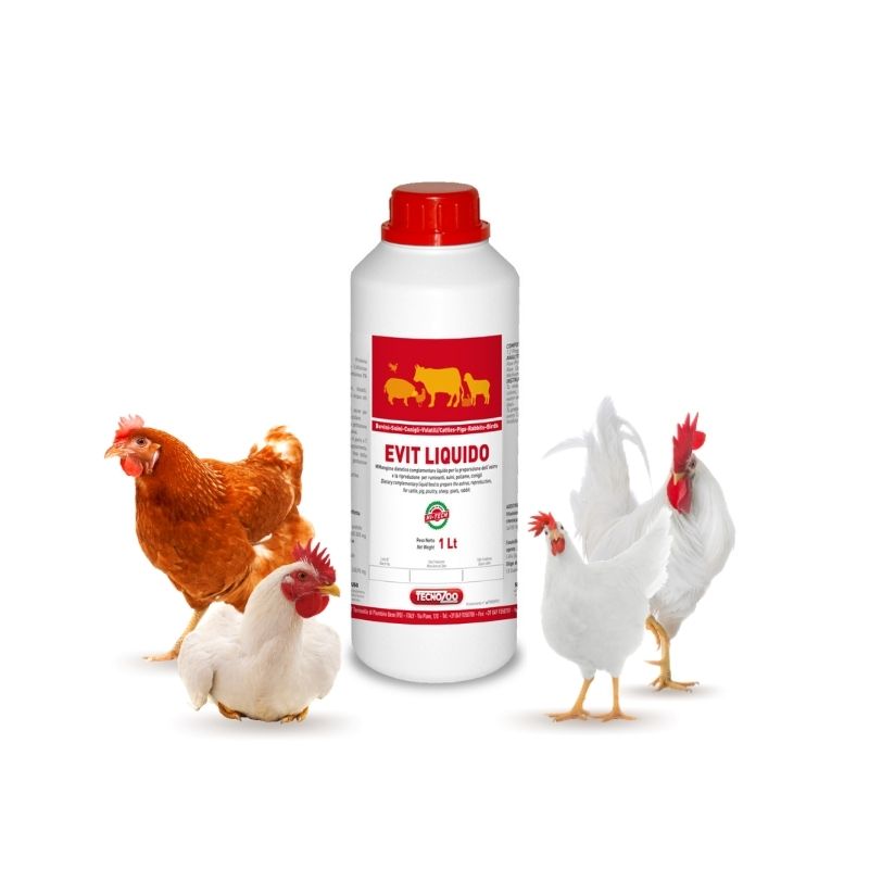EVIT LIQUIDO è un mangime complementare liquido da aggiungere all’acqua di bevanda in ragione di 100ml/ 100L per integrare la dieta con vitamina E e selenio.