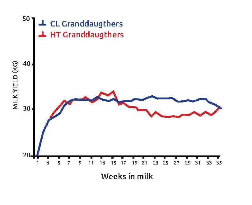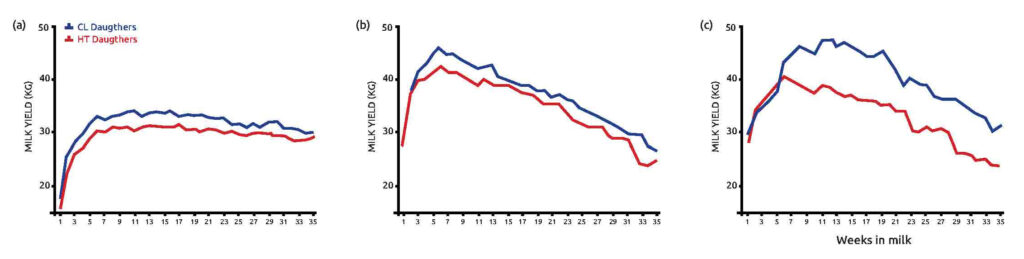 Le vacche di figura 1 sono state divise per ordine di parto, gli animali CL sono le figlie nate da madri raffrescate nell’ultima fase della gravidanza (~46 giorni) durante lo stress termico (ombra, ventilatori e doccette) mentre quelli HT sono nate da vacche che hanno avuto solo ombra. Tutte le vacche sono state raffrescate durante le tre lattazioni. Come si vede la perdita di produzione è evidente in tutte e tre le lattazioni.