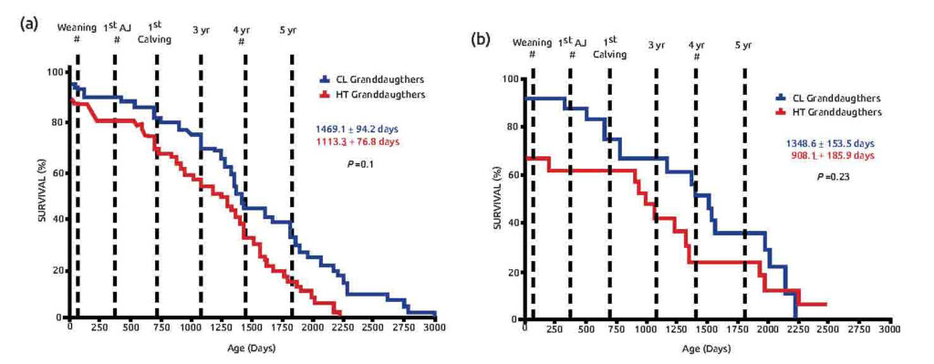 Figlie e nipoti di vacche in stress da caldo, hanno mostrato effetti negativi su: tasso di sopravvivenza (Figura 3) dalla nascita al primo parto, durata della vita produttiva, produzione di latte e dei suoi componenti, durante le 3 lattazioni.